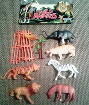 Набор диких животных 46405 Комплект диких животных резиновые. Лев, тигр, антилопа, зебра бегемот, зебра. Так же в комплекте есть заборчик и немного веточек. Материал: жесткая резина Упаковка: пакет Размер упаковки: 22*20 см Размер животных: 10-15 см Возраст 3+ Самовывоз: г.
