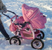 коляску-трансформер зима/лето фирмы Тако(польша), розовую, Б/У, в отличном состоянии, в комплекте:люлька-переноска, сумка для мамы, дождевик, чехлы зимние.Большие резиновые надувные колеса.